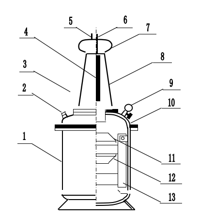 氣體式試驗變壓器采用單框芯式鐵芯結(jié)構(gòu),初級繞組繞在鐵芯上,高壓繞組在外,這種同軸布置減少了漏磁通,因而增大了繞組間的耦合。產(chǎn)品的外殼為圓柱灌式容器結(jié)構(gòu),能耐受0.8MPa以上壓力。其結(jié)構(gòu)見下圖: