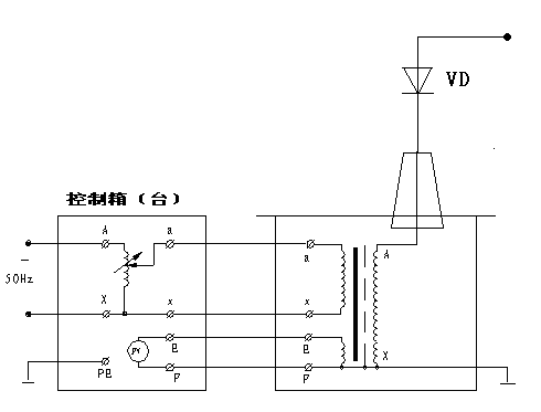 圖3:交流干式試驗變壓器接線 2. 交直流干式試驗變壓器:如圖4 圖中高壓輸出的上端裝有高壓硅堆,串接在高壓回路中作半波整流,以獲得直流高電壓。當取下不接高壓硅堆時,作為直流輸出狀態(tài)。
