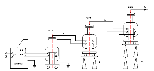 圖4:交直流干式試驗變壓器接線 圖中:VD為高壓硅堆 3. 串級干式試驗變壓器接線及原理:如圖5 串級干式試驗變壓器有很大的優(yōu)越性,三臺試驗變壓器串級連接可獲得更高的電壓,因為整個試驗裝置由幾臺單臺試驗變壓器組成,單臺試驗變壓器容量小、電壓低、重量輕,便于運輸和安裝。它既然可串接成高出幾倍的單臺試驗變壓器輸出電壓組合使用,又可分開成幾套單臺試驗變壓器單獨使用。整套裝置投資小,經(jīng)濟實惠。圖5中,在第一級和第二級的每個單元試驗變壓器中都有一個勵磁繞組A1、C1和A2、C2。在串級試驗變器基本原理圖中,低壓電源加在試驗變壓器I的初級繞組a1x1上,單臺試驗變壓Ⅰ、Ⅱ、Ⅲ的輸出電壓都是V。勵磁繞組A1、C1給第二級試驗變壓器Ⅱ的初級繞組供電;第二級試驗變壓器Ⅱ的勵磁繞組A2、C2給第三級試驗變壓器Ⅲ的初級繞組供電。第二級試驗變壓器Ⅱ和第三級試驗變壓器Ⅲ的箱體分別處在對地為1V和2V的高電位上,所以箱體對地是絕緣的,試驗變壓器I的箱體是接地的。這樣第一級、第二級、第三試驗變壓器對地的額定輸出電壓分別為1V、2V、3V;其額定容量分別為3P、2P、1P。