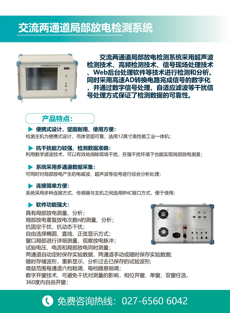 交流兩通道局部放電檢測(cè)系統(tǒng)是我公司技術(shù)人員根據(jù)多年高壓電氣設(shè)備局放檢測(cè)經(jīng)驗(yàn)設(shè)計(jì)生產(chǎn)。