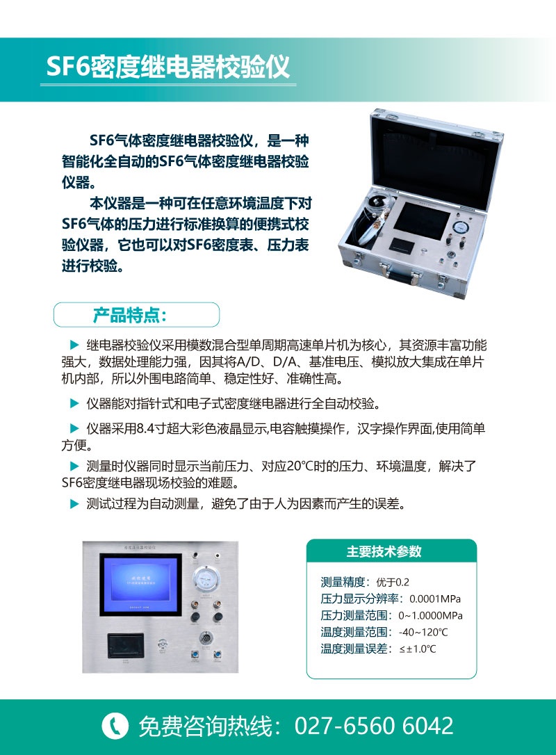SF6氣體密度繼電器校驗儀,是一種智能化全自動的SF6氣體密度繼電器校驗儀器。該儀器采用單周期指令微機技術,運行速度是普通單片機的20倍,能對指針式接點輸出及智能式電流輸出的SF6密度繼電器進行現場校驗,采用中斷方式對密度繼電器的動作進行實時捕獲,因此該儀器測量更準確及時。